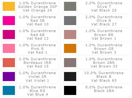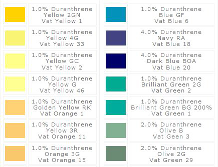 Cotton can be dyed with vat dyes. The process of vat dyeing refers to dyeing in a bucket or vat. It can be performed whenever a solid even shade, the same colour over the entire garment, is wanted, using almost any dye, including fibre reactive dye, direct dye, acid dye, etc. One alternative to vat dyeing is direct dye application, such as the process used for tie dyeing. Note that not all vat dyeing is done with vat dyes and the colours shown here in this article are for demonstration purposes only as colours vary with individual monitors and therefore cannot be guaranteed as accurate.